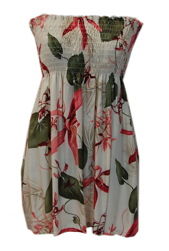 This smocked top is made in our soft rayon. Smocking at the chest with popular Hawaiian design. Great for the beach and summertime. Top can also wear as strapless.
