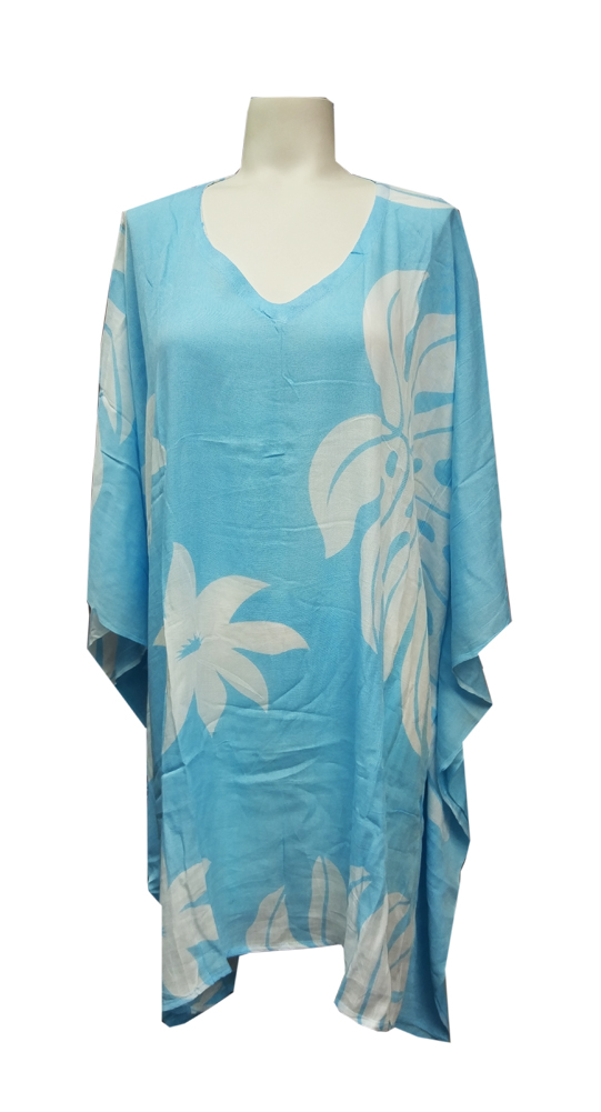 A fun and easy to wear poncho style top for summer sun. This loosely fit top is made of cool fabric in light blue background with white tropical Monstera leaf and Tiare flower designs. Great to use it as beach cover up or wear it as top with your favorite legging.