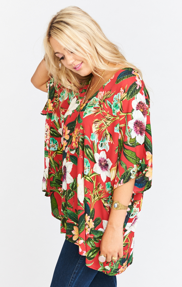 Beautiful flowers pattern in a red black ground. This top is comfortable and perfect for any time of the day in the beach or for parties. Best to throw over your bikini and great to pair with shorts, legging or jeans.