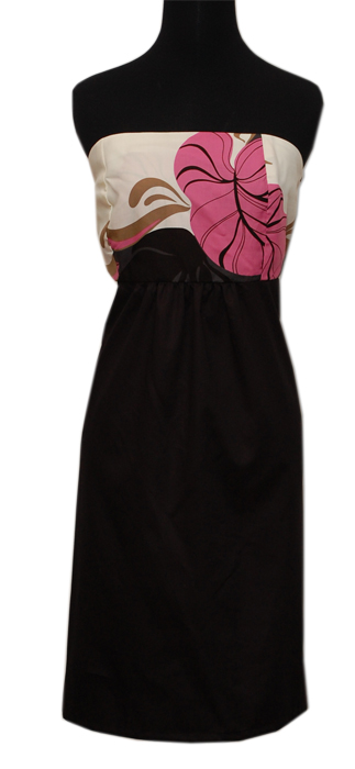 A great dress for the summer in this cream blue background with Hawaiian leaf design in pink color. This is a tube top dress with a colorful print on top with solid contrast on the bottom. The dress has an elastic back with easy access back zipper.
